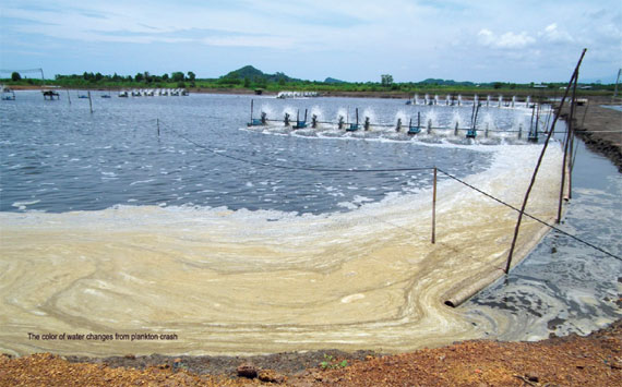 6. Kiểm soát mật độ phiêu sinh thực vật thích hợp: Nếu người nuôi kinh nghiệm khi tảo tàn, hàm lượng NH3 tăng, hàm lượng oxy giảm bởi vì các mầm bệnh trong ao nuôi sẽ sử dụng lượng lớn oxy để tiến hành phân hủy sinh học tảo chết. Tôm sẽ trở nên yếu và sống gần vùng thu gom chất thải, đó là nguyên nhân gây làm cho tôm bị nhiễm bệnh. Gây màu tảo trong ao nuôi có rất nhiều cách, những ao nuôi được cải tạo kỹ sẽ rất dễ dàng tạo màu nước. Đối với những trang trại nuôi tôm nằm trong khu vực nguy hiểm chẳng hạn như những trang trại nuôi tôm mật độ cao và sử dụng chung nguồn nước. Đối với trường hợp sử dụng chung nguồn nước thì cần phải dùng hóa chất mạnh để xử lý nước trước khi thả tôm, bước này sẽ làm cho nước trở nên trong và khó gây màu. Người nuôi cần sử dụng phân hóa học (16/20/0) với tỷ lệ 1 – 2 kg/rai (1.600 m2) và thêm 05 kg muối khoáng/rai vào buổi sáng để tạo màu nước. Sau đó sử dụng 5 kg muối khoáng vào ao 02 ngày một lần vào buổi sáng để giữ màu nước thích hợp. Nếu màu nước ao nuôi trở nên tối sậm thì cần ngừng hoặc giảm cho ăn và thay nước bằng cách xả bớt nước cũ và thay nước mới từ ao nước đã được xử lý.