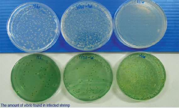 Ở gai đoạn đầu, những con tôm này trông bình thường nhưng thực ra chúng rất yếu và không hoạt động tốt. Khi thực hiện phương pháp mô bệnh học với gan tụy của những con tôm bị bệnh, chúng tôi nhận thấy gan tụy của chúng bị teo, co rút lại và lượng chất béo bị giảm tương ứng với sự tăng lên của số lượng vibrio.